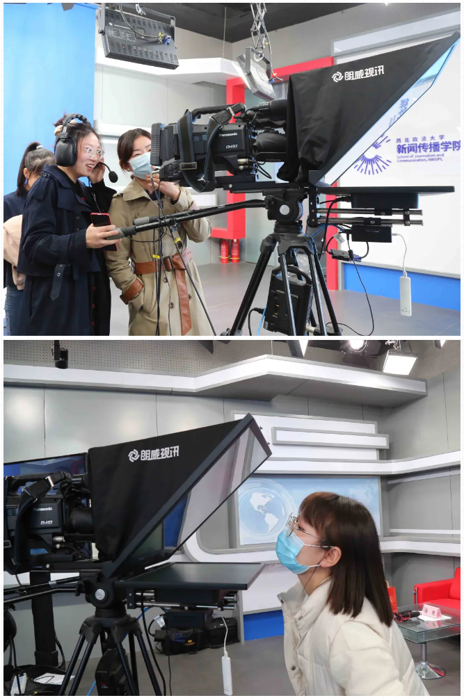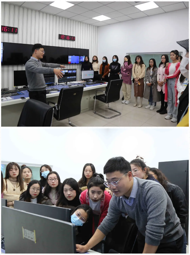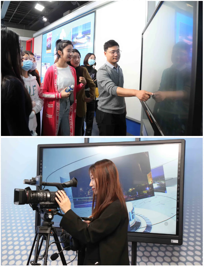 演播厅分为主播区、虚拟区、点播区、三联屏区以及访谈区,设计简洁明快,利用先进的制景手段达到充分的视觉效果。在演播厅内,崔保锋老师讲述各个区域的功能,同学们试用提词器、摄像机等设备。
