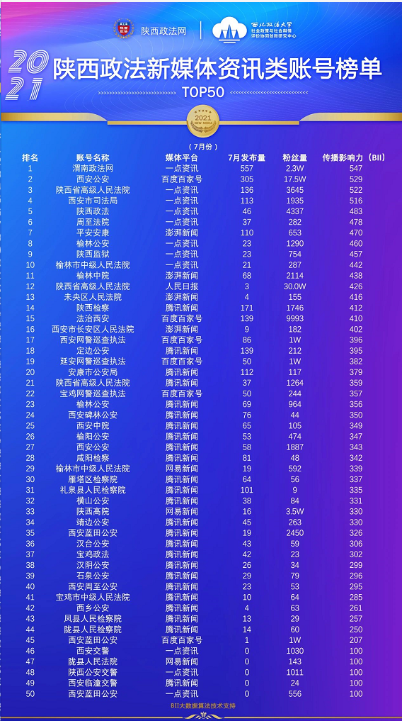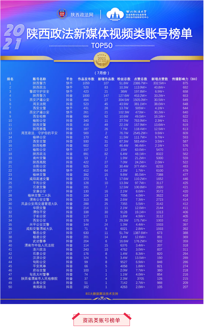 本期陕西政法新媒体账号榜单有5个,即:微信公众号榜单、微博榜单、头条号榜单、视频类榜单、资讯类账号榜单。