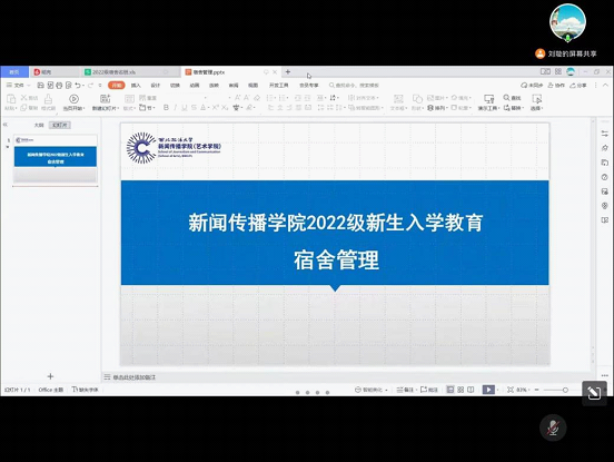 为加强新生宿舍管理和安全教育,提高学生安全意识,营造和谐融洽的宿舍环境,稀饭动漫 11月10日组织开展2022级本科新生宿舍安全教育培训会。会议通过线上方式开展,由2022级辅导员刘璇主讲,2022级本科新生全体宿舍长参会。
