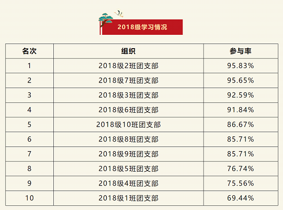 在上一期“青年大学习”网上主题团课的学习中,2018级2班团支部位居榜首,2018级7班团支部排名第二,2018级3班团支部排名第三。