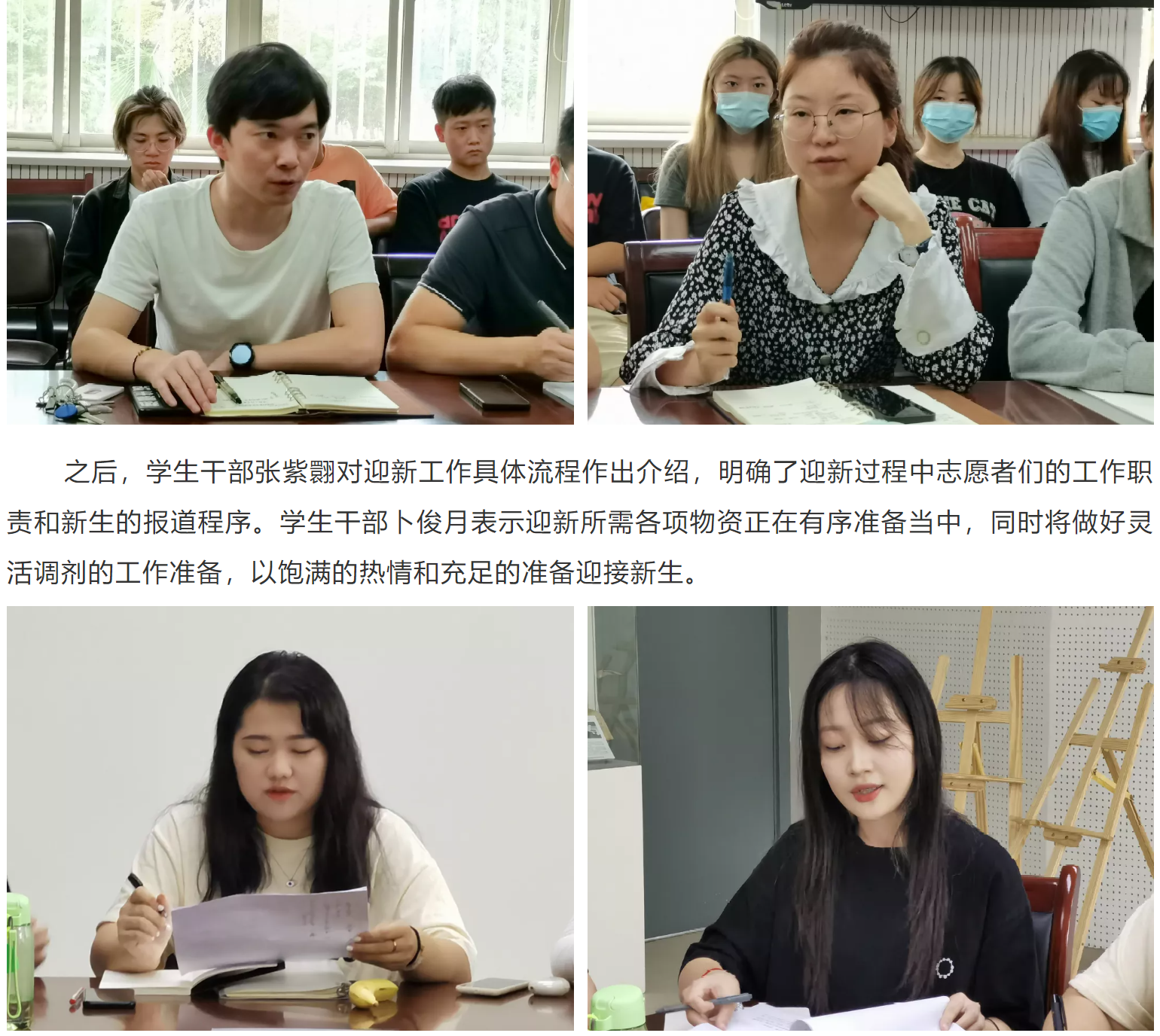随后,崔梁凡指出迎新过程中应充分明确各岗位工作职责、迎新工作重点任务和完成时间节点。强调迎新工作是展示学院风采,树立形象的良好契机,新媒体宣传人员应快速准确做好跟踪报道。李佳欣希望参与迎新的各位同学能够以积极热情的态度对待迎新工作,使新生们能够保持对大学生活的憧憬,从而以乐观向上的态度开启自己的大学生活。