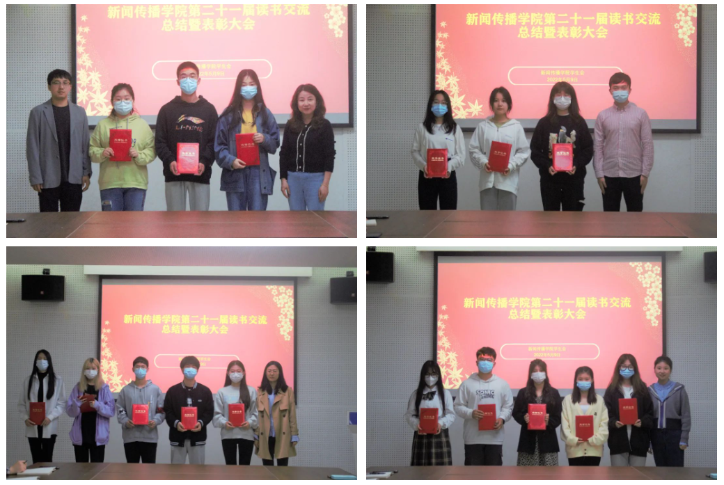 大会回望了过去学院在读书方面开展的活动与成就。随后,崔梁凡宣读获奖名单。刘璇、李佳欣为获得三等奖的同学颁发证书并合影留念。崔梁凡为获得二等奖的同学颁发证书并合影留念。秦音、巩飞为获得一等奖的同学颁发证书并合影留念。