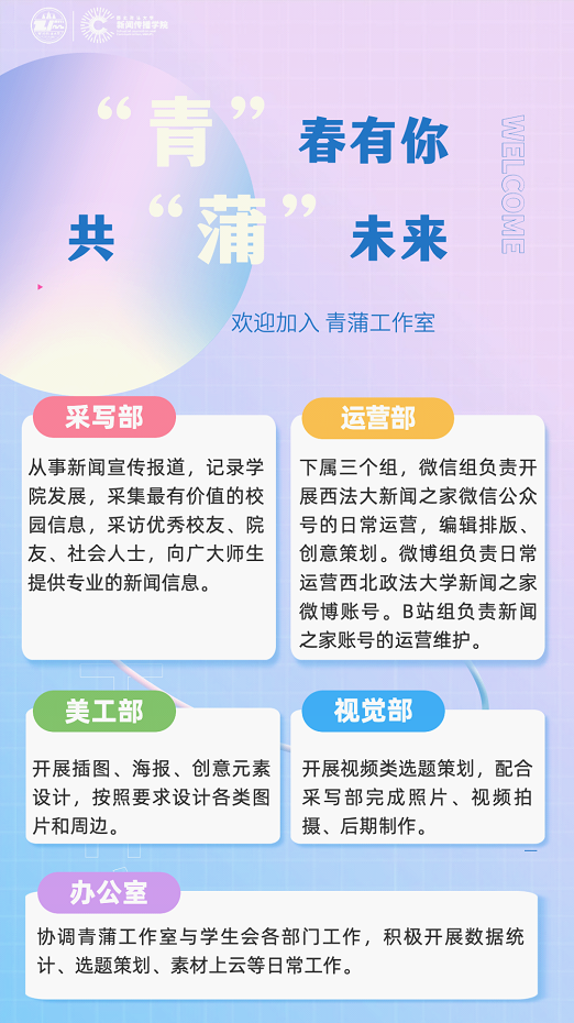 为进一步整合稀饭动漫 新媒体中心各平台资源,形成媒体宣传合力,稀饭动漫 青蒲工作室用文字、图片、视频等多媒体形式讲述你、我与西法大,特别是和新传有关的故事。作为稀饭动漫 学生会的一部分,青蒲工作室负责学院官方微信公众账号、视频号、微博账号、B站号等的运营,策划学院各项大型活动和晚会线上线下互动的新媒体宣传活动,下设五个部门,分别是采写部、运营部、美工部、视觉部、办公室,各部门之间分工明确,效率极高,在相互配合的过程中不仅提升了参与同学的实践能力,也让新闻之家成为越来越具有影响力的校内媒体。