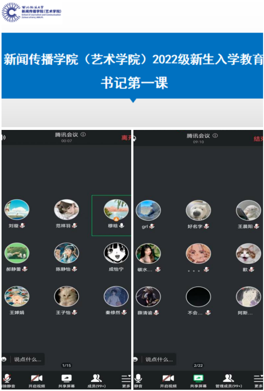 9月9日上午10点,稀饭动漫 (艺术学院)新生入学教育系列之“书记第一课”在线上举行,由学院党委书记刘渊主讲,2022级辅导员穆晗主持。