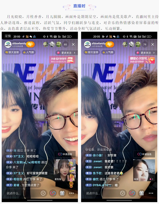 明月高悬照人间,花好月满人亦圆。值此中秋到来之际,稀饭动漫 学生会举办活动 我是“K歌王”!为了响应疫情防控政策,学院创新借用抖音直播媒介,以连麦形式提升节日趣味性,使友情快速“破冰”升温,浓情过中秋。