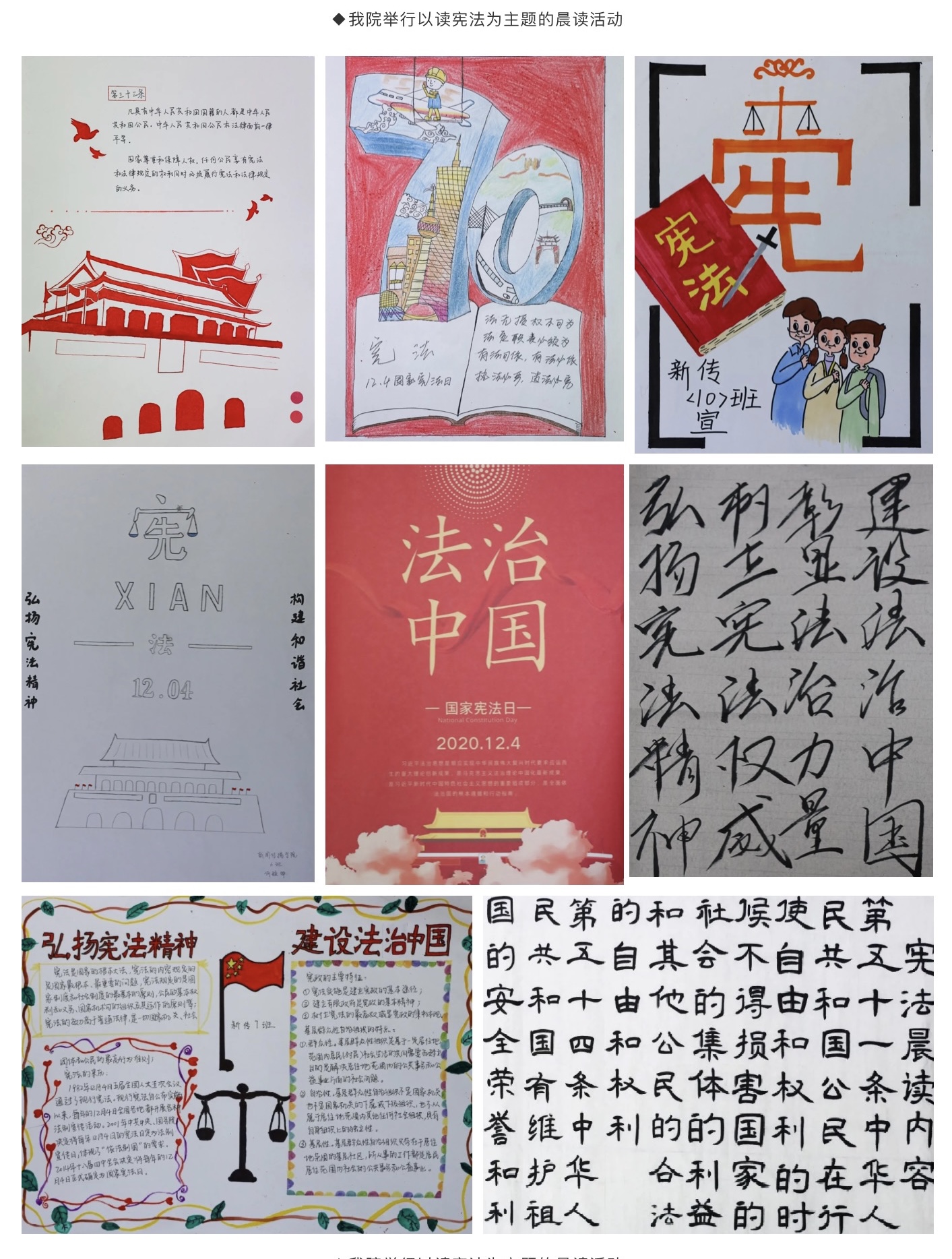 “中华人民共和国是工人阶级领导的、以工农联盟为基础的人民民主专政的社会主义国家。”学院2020级在12月4日当天开展以读宪法为主题的晨读活动,组织师生朗诵宪法原文,体悟宪法精神,增强法治观念。围绕宪法宣传主题,在同学中征集手抄报、书画、电子海报等作品,创新学宪法形式,让宪法学习活动生动鲜活起来,提升宣传效果。