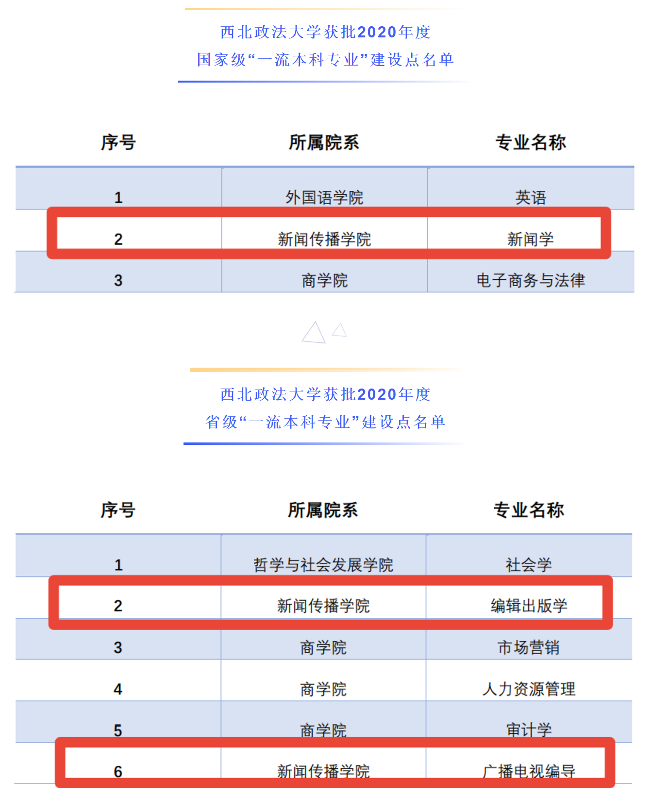 近日,教育部公布了2020年度国家级和省级“一流本科专业”建设点名单,我院新闻学专业获批国家级“一流本科专业”建设点,编辑出版学、广播电视编导两个本科专业获批省级“一流本科专业”建设点。