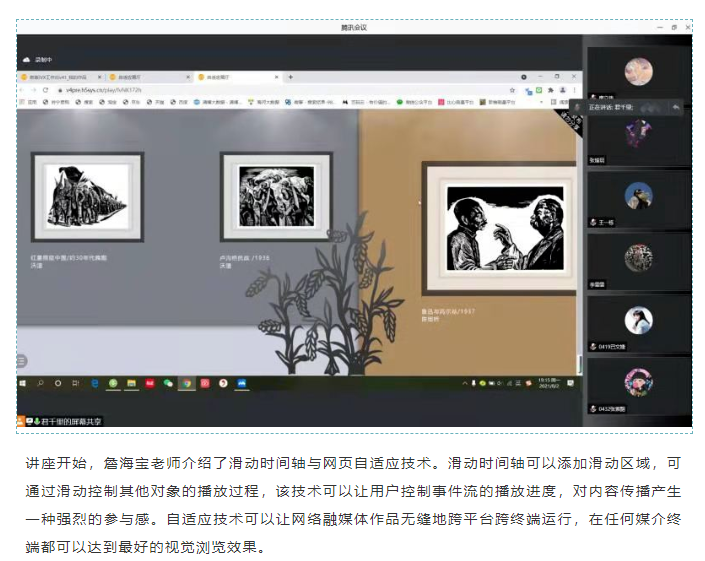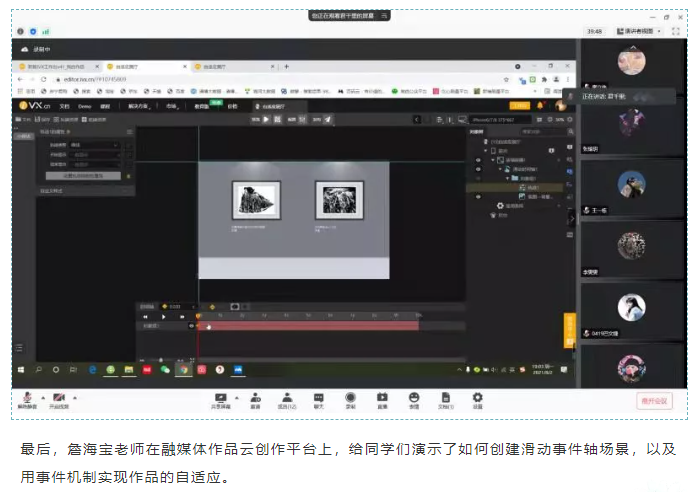 为了提高我院学生利用新媒体进行红色文化传播的技能,网络与新媒专业詹海宝老师于2021年8月2日18:00至20:00,在线上给同学们做了“基于滑动时间轴的交互式红色文化宣传作品创作”实践讲座。