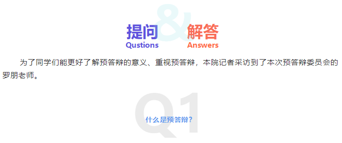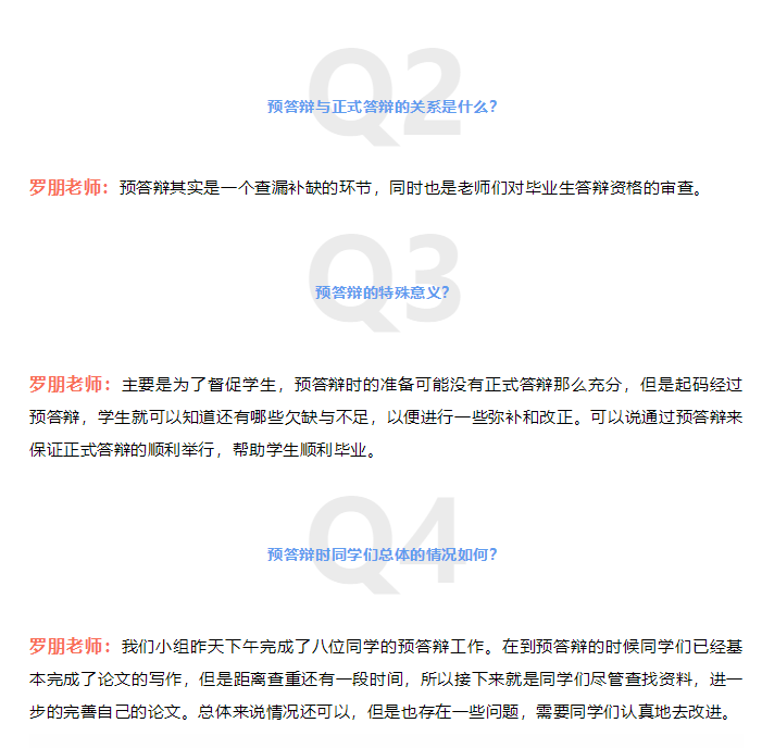 罗朋老师:预答辩就是在对毕业生进行的答辩资格审查。预答辩的程序和要求与正式答辩基本一致,答辩组老师会审核毕业生的毕业论文或设计作品,判断其选题和内容是否达标,通过预答辩的毕业生可以参加之后的论文查重,查重合格后才可以参加正式的毕业论文(设计)答辩。预答辩目的是为了让大家更加清楚地了解毕业答辩的完整流程,也让老师们对学生论文进行前期检查,提出修改意见,督促学生进一步完善自己的毕业论文或设计,以保证正式答辩的顺利进行。