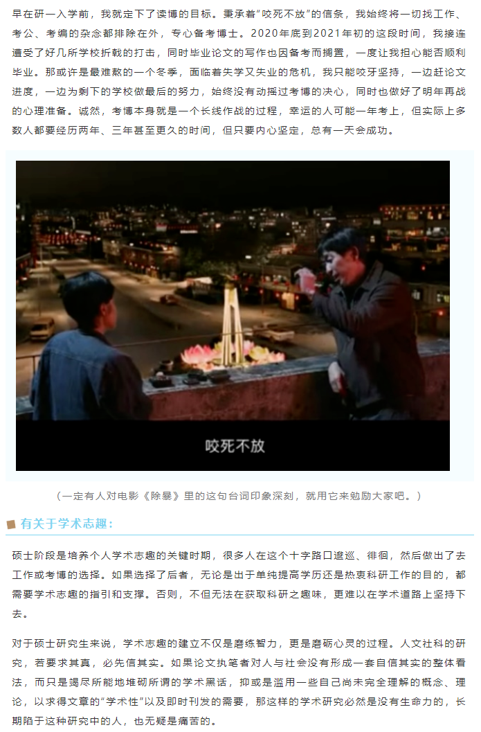 在备考的过程中,我寻求了很多同学和老师的帮助。一方面,向有考博经验的学长、学姐们学习笔试和面试经验,向老师们请教研究计划的撰写;另一方面,向他们了解各院校、导师的具体招生偏好。和考研一样,考博也是一场信息战,对目标院校和导师的信息掌握越充分,越有利于我们做出成功率更高的选择。