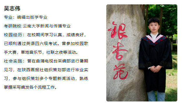 吴志伟报考的新闻传播专硕,偏向于实践,他期望在研究生期间,培养自己的理论素养的同时,努力提升自己的实践技能,多参加一些形式多样的活动。希望在未来能够成为一名优秀的新闻人,从事与媒体相关工作。人生总是在不停的找寻与丢失,好不容易找到前进的方向,就要坐定信念,把所有慵慵沉迷与不前归还给昨日,做到与世界交手多年,依旧兴趣盎然,坦然追梦。