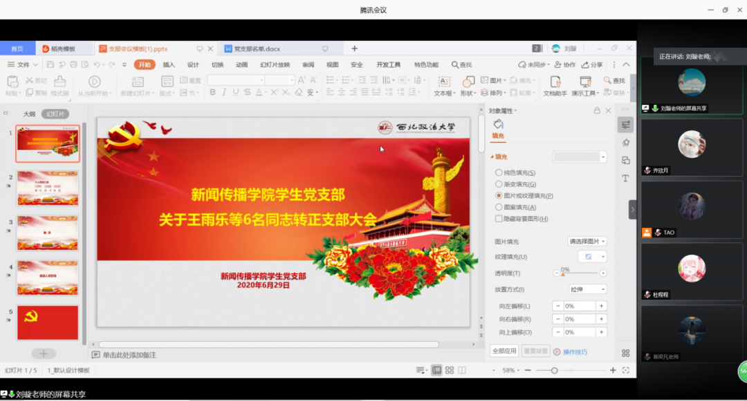 为进一步规范学院学生党员发展程序,强化学生党员模范带头作用,提升学生党员爱国意识,2020年6月29日13:00,我院学生党支部在“腾讯会议”召开预备党员转正会议,并开展微党课学习活动。学院党委副书记兼副院长秦音、全体辅导员、申请转正的预备党员和全体学生党员参与会议。