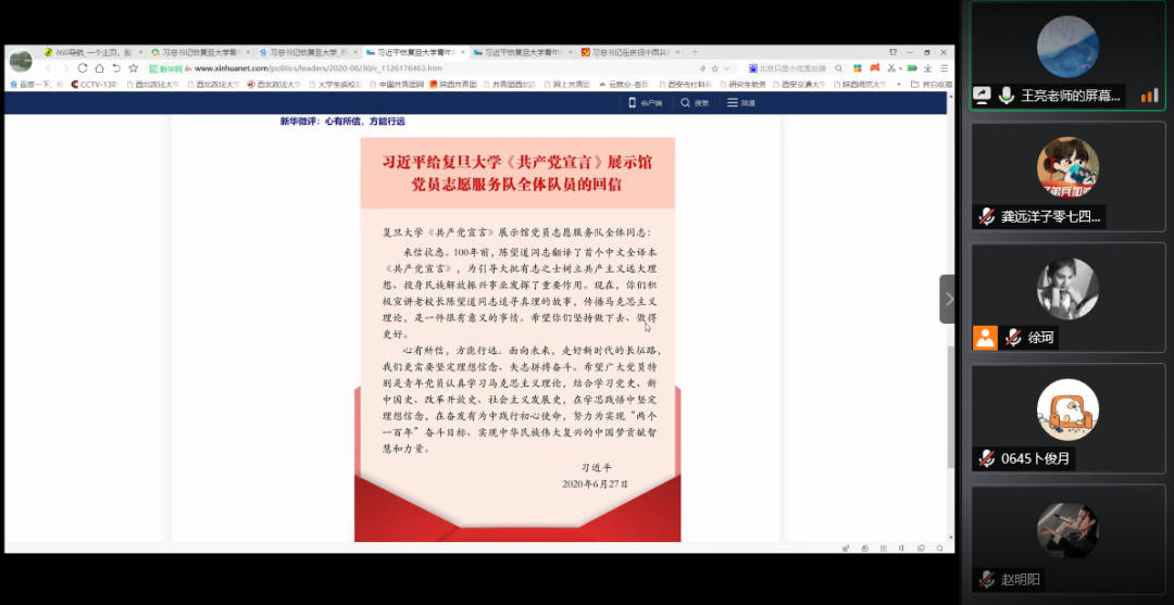 在学院党委指导下,学院团学干部在2016级辅导员王亮的带领下共同学习领会习近平总书记给复旦大学《共产党宣言》展示馆党员志愿服务队全体队员的回信精神。王亮要求大家结合习近平总书记来陕考察重要讲话重要指示精神和给高校师生历次重要回信和指示批示精神系统学、深入学、带着问题学,努力做到真学真信、真懂真用,确保学习效果。在各班班级群内,大家谈感受、说体会,用一篇篇感情真挚的推送,表达自己的祝福。2019级广播电视学专业学生张卓表示,在中国共产党成立99周年之际,能够分享党课学习中的认识,讲述共青团员的担当,我感到骄傲。党员两个字,不仅是一个头衔与荣誉,更是一份使命与担当。一个共产党员的力量是有限的,千千万万的共产党员同心协力,涓滴汇海,这份力量就会变得非常巨大。