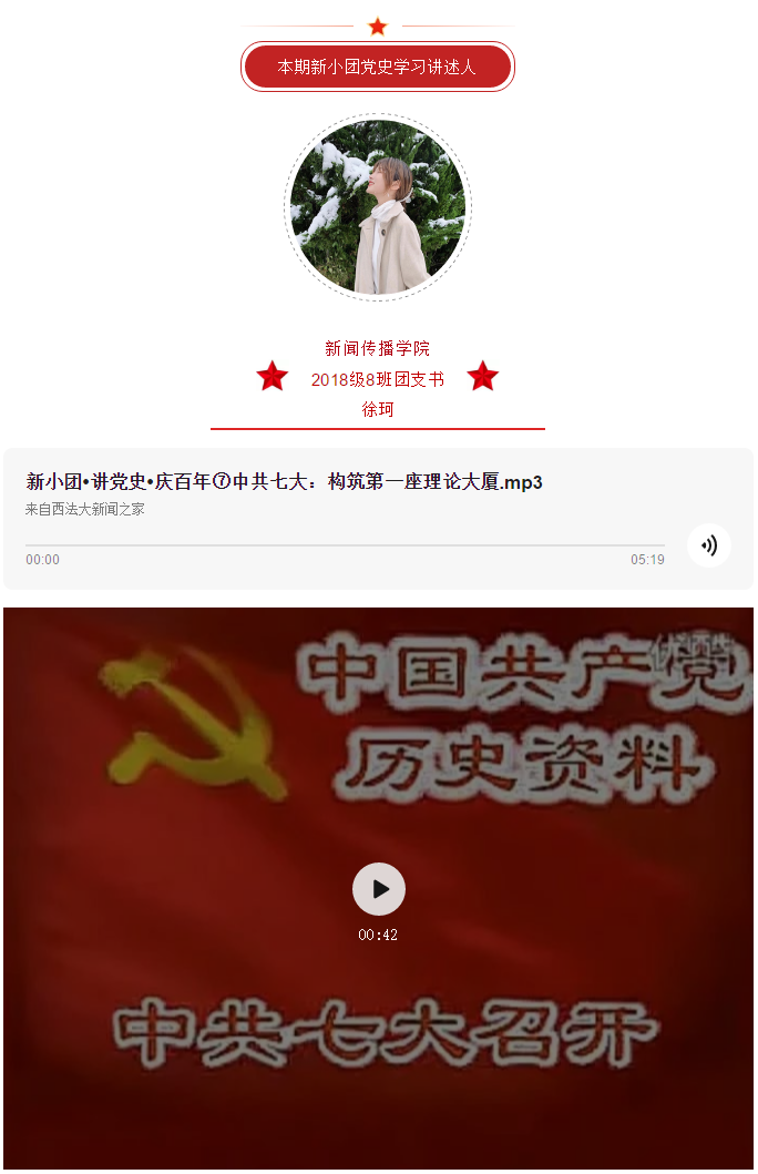 为迎接中国共产党百年华诞,扎实推进党史学习教育,教育引导我院青年学生学史明理、学史增信、学史崇德、学史力行,以青春激昂、舍我其谁的奋斗姿态向建党百年献礼。稀饭动漫 团委启动“新小团•讲党史•庆百年”主题线上推送活动,由老师同学共同讲述中共一大到中共十九大的故事,用声音重温百年记忆,用故事回首百年征程。让我们一起聆听,在党史学习教育中汲取奋进力量!