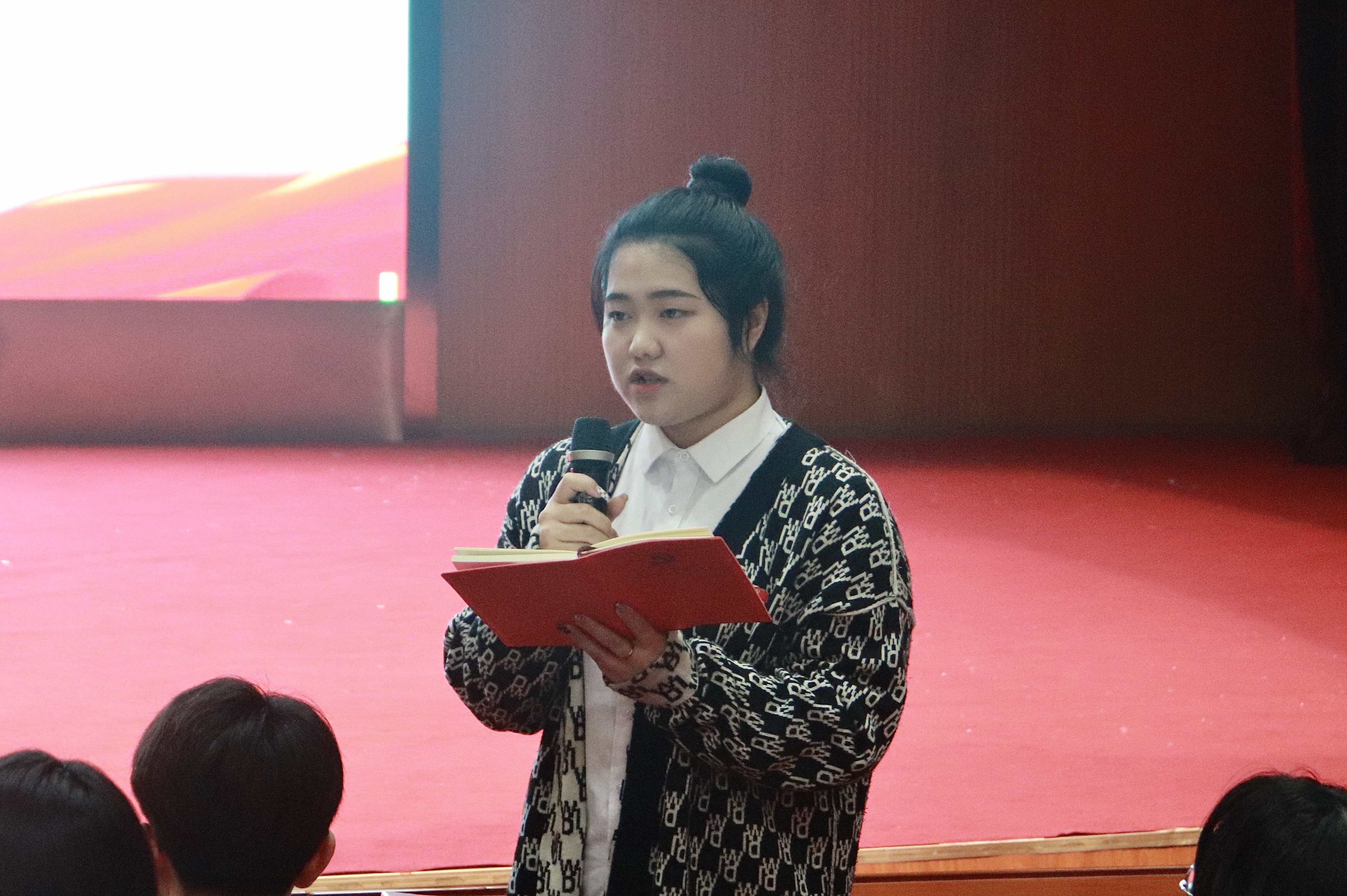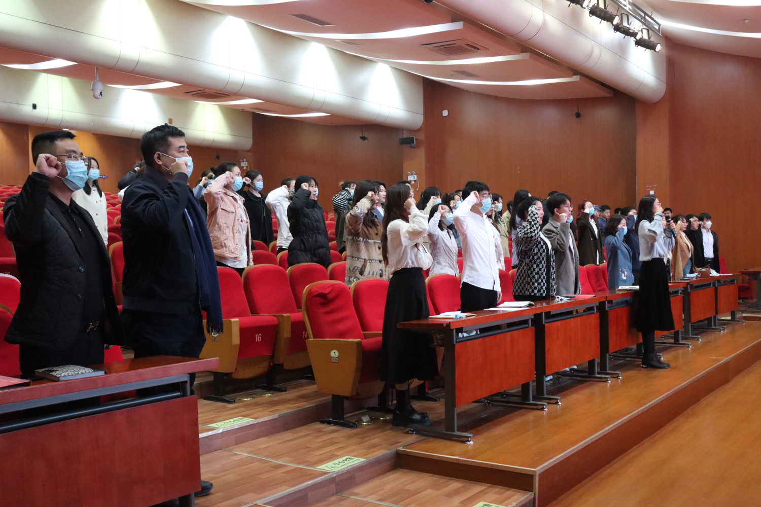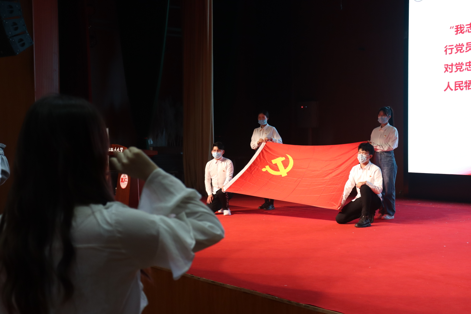本科生第三党支部书记刘璇带领全体党员重温入党誓词:“ 我志愿加入中国共产党,拥护党的纲领……”,庄严的宣誓声在满天星报告厅久久回荡。