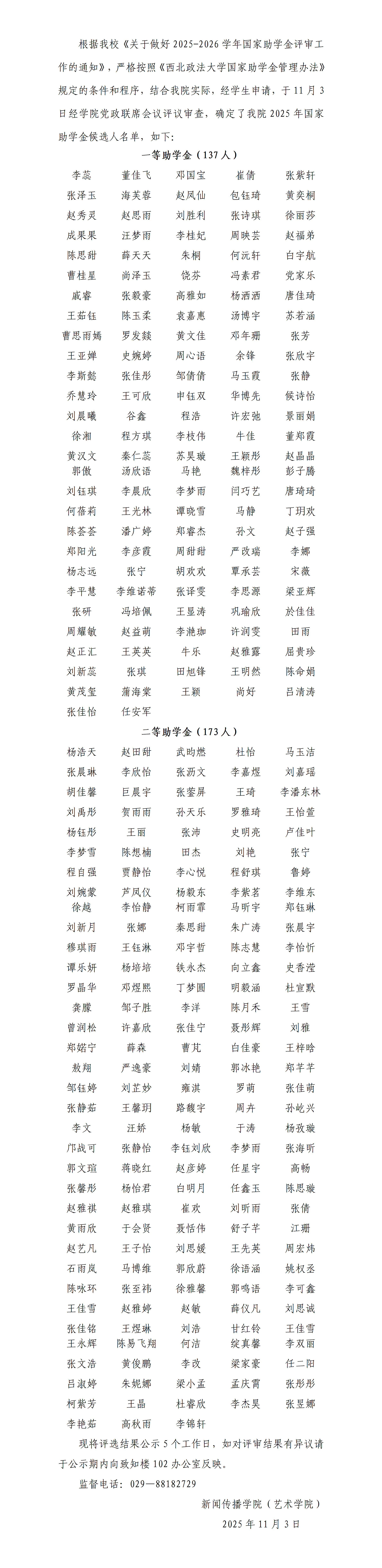 关于稀饭动漫 2025-2026学年国家助学金评选结果的公示