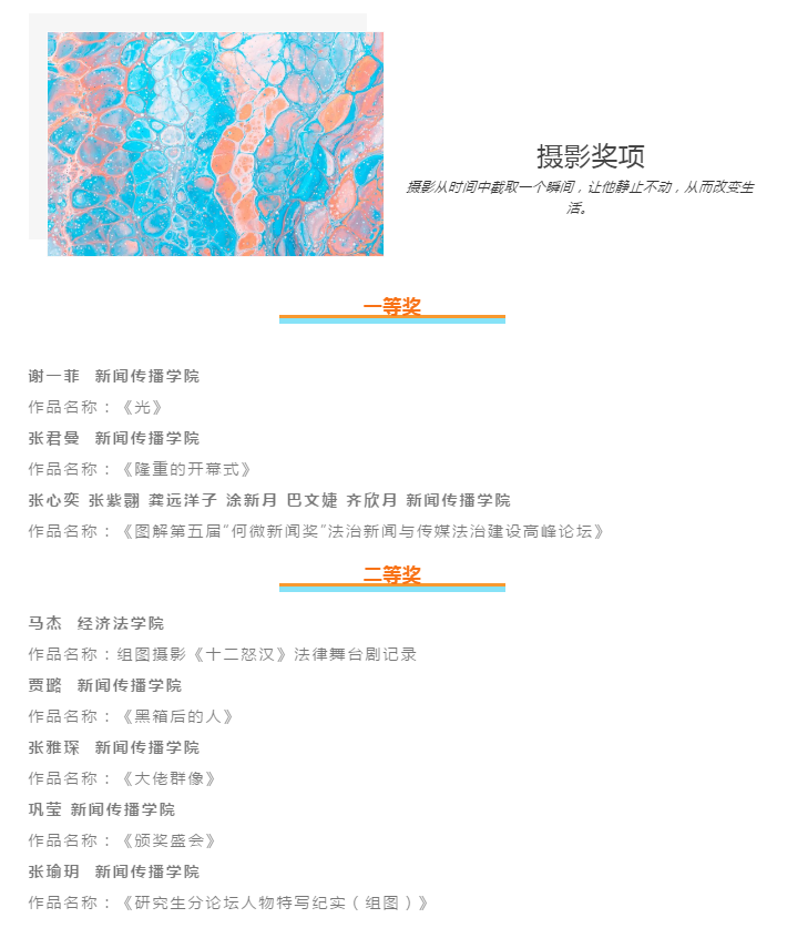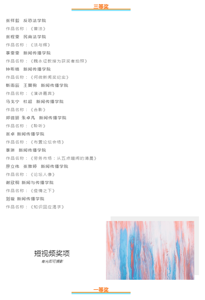 自11月4日发布大赛公告以来,通过线上投稿渠道,组委会在全校范围内共收到摄影、短视频类作品100余件,本着公平、公正的原则,经过评委组的初审、复审和终审,共评选出摄影、短视频类获奖作品共计25件,获奖名单如下: