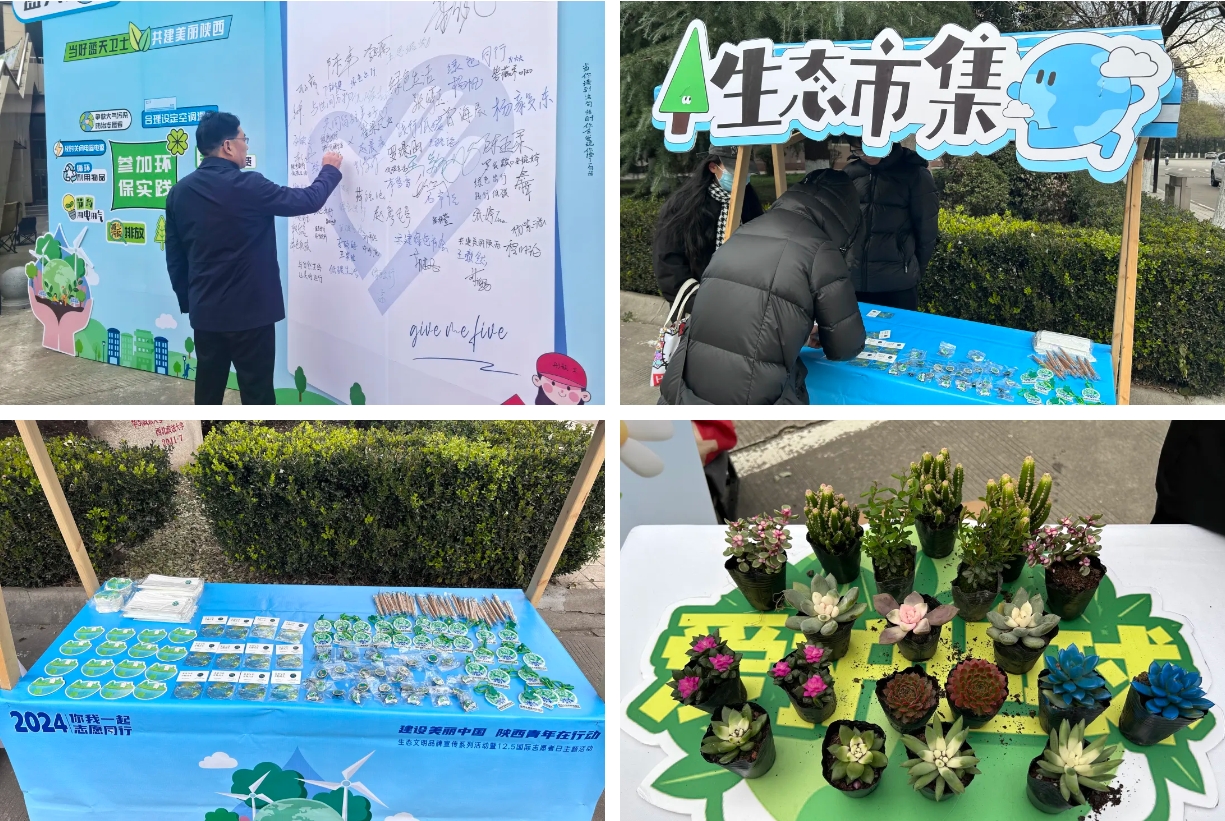 活动现场布设了生态环境科普展区、环境普法展区、志愿者主题展区、互动生态环境市集区共四个展区,通过发放陕西生态环境志愿服务通识手册、设置低碳知识问答、空瓶再利用绿植DIY、生态文创作品展示市集摊位,吸引众多学生驻足观看,激发青年学生关注生态环境的热情。