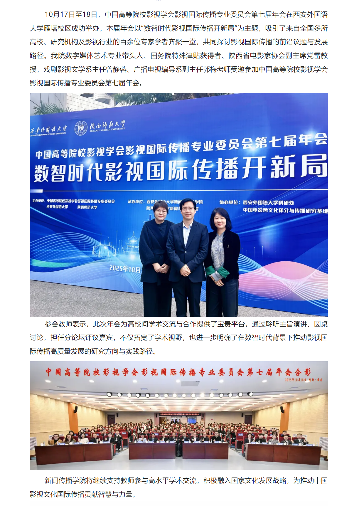 下一篇:我院邢小俊教授受邀录制的《温暖的回响——学习贯彻习近平总书记历次来陕考察重要讲话重要指示精神(文化篇)》在学习强国陕西平台展播