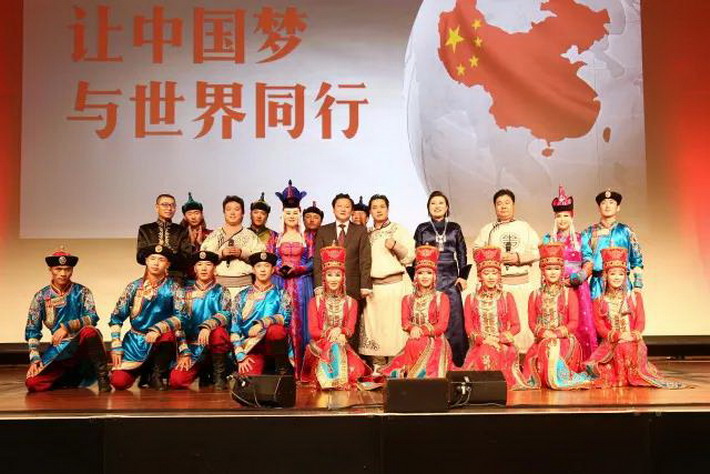 的研究生。简短的致辞之后,不少嘉宾前来邀请实习小组为他们拍照,并对拍摄的照片交口称赞。晚8时,由内蒙古民族艺术剧院演出团带来的“民族文化 中华瑰宝”文艺演出开始,极富民族特色的歌舞表演《鄂尔多斯》《敖包相会》等节目,让在场同胞深深感受到故乡情、家国情。文艺表演结束后,冯海阳总领事上台带领全场同胞满怀激情地齐声唱响《歌唱祖国》,在歌声中表达祝愿伟大祖国繁荣昌盛的美好心愿。