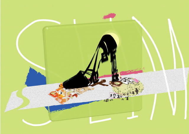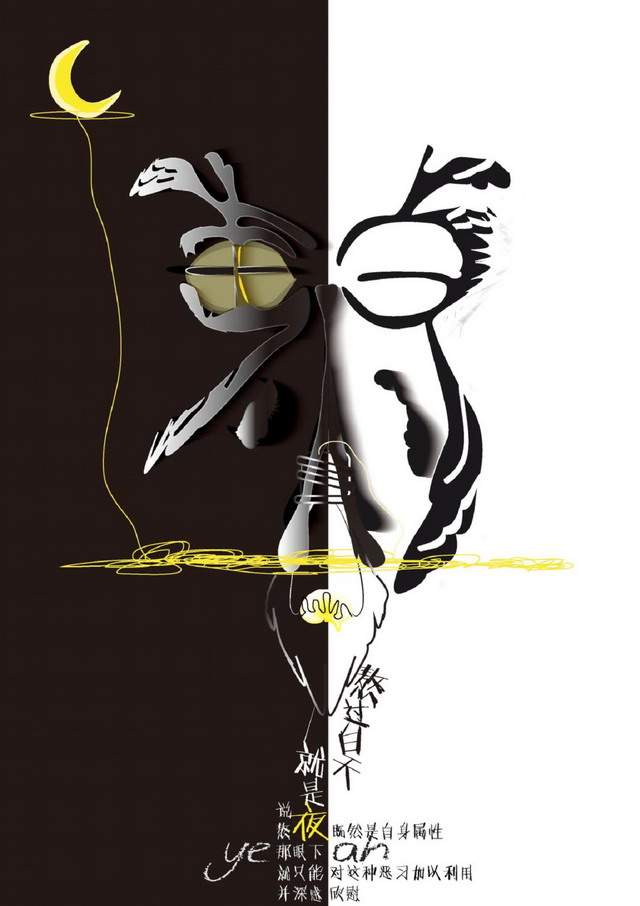 画面介绍:一只猫头鹰站在白昼之间有着两种不同的状态。猫头鹰形体由金文熬字变形而成,尾部由电灯泡变形组成。