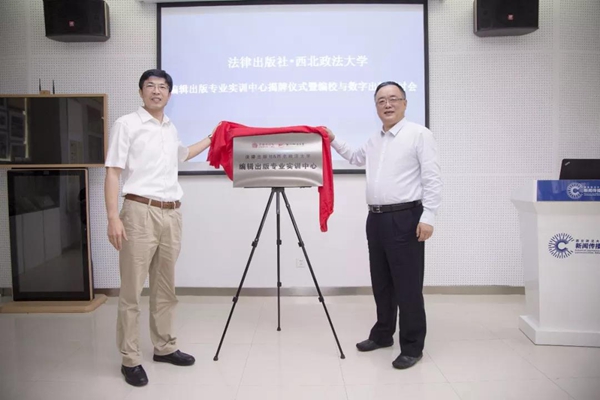 王麟副校长和法律出版社社长助理张宇东共同揭牌。教务处副处长李永宁与稀饭动漫 副院长王俊荣为班运华和周洋两位老师颁发实务导师聘书,“法律出版社—稀饭动漫 编辑出版专业实训中心”正式挂牌成立。
