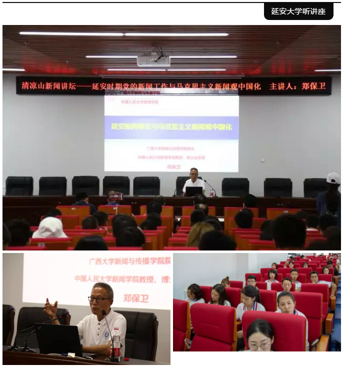 下午1点30分,我院实践团队前往延安大学并有幸聆听了广西大学新闻与传播学院院长、中国人民大学新闻学院教授郑保卫所做的以“延安时期党的新闻工作与马克思主义新闻观为主题”的讲座。
