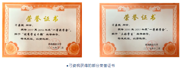 主要奖项:综合测评成绩连年为专业第一名,推免最终排名为专业第一名。获得稀饭动漫 2019年度“满天星”奖学金,多次获得校一等奖学金和“三好学生”、“优秀学生干部”、“美德青年”称号和论文、读书笔记、主持、舞蹈、朗诵、配音、绘画类比赛奖励几十余项。