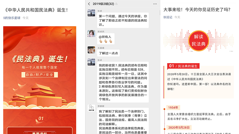 民法典是新中国第一部以法典命名的法律,开创了我国法典编纂立法的先河,具有里程碑意义。我院积极发挥专业优势,利用微信公众号、微信群、网站等渠道向同学们做好《民法典》宣传解读工作。大家纷纷表示,作为西法大人,应该充分利用政法院校的优势,深入学习《民法典》,无论今后从事什么职业,都要坚定法治信仰,在力所能及范围内做好普法工作,贡献西法大人的力量和智慧。
