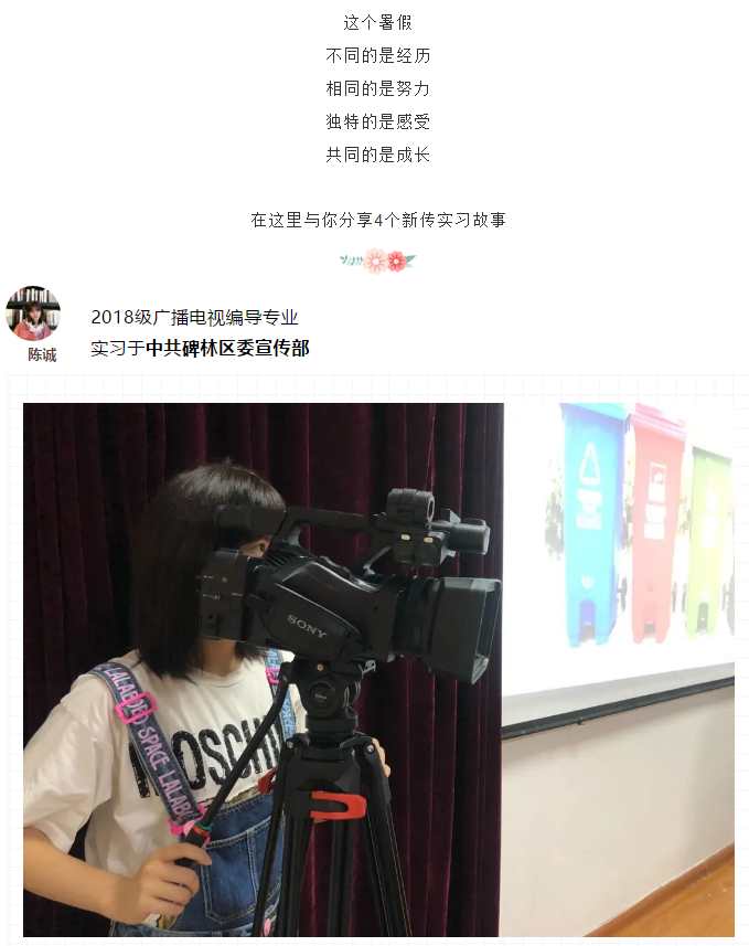 在陈诚实习期间,她明白一个道理就是一定不能纸上谈兵,只有在实操的时候才会发现,有很多时候美好的设想不一定会完全实现,尤其是像广编专业的学生更应该注重专业实践类活动。