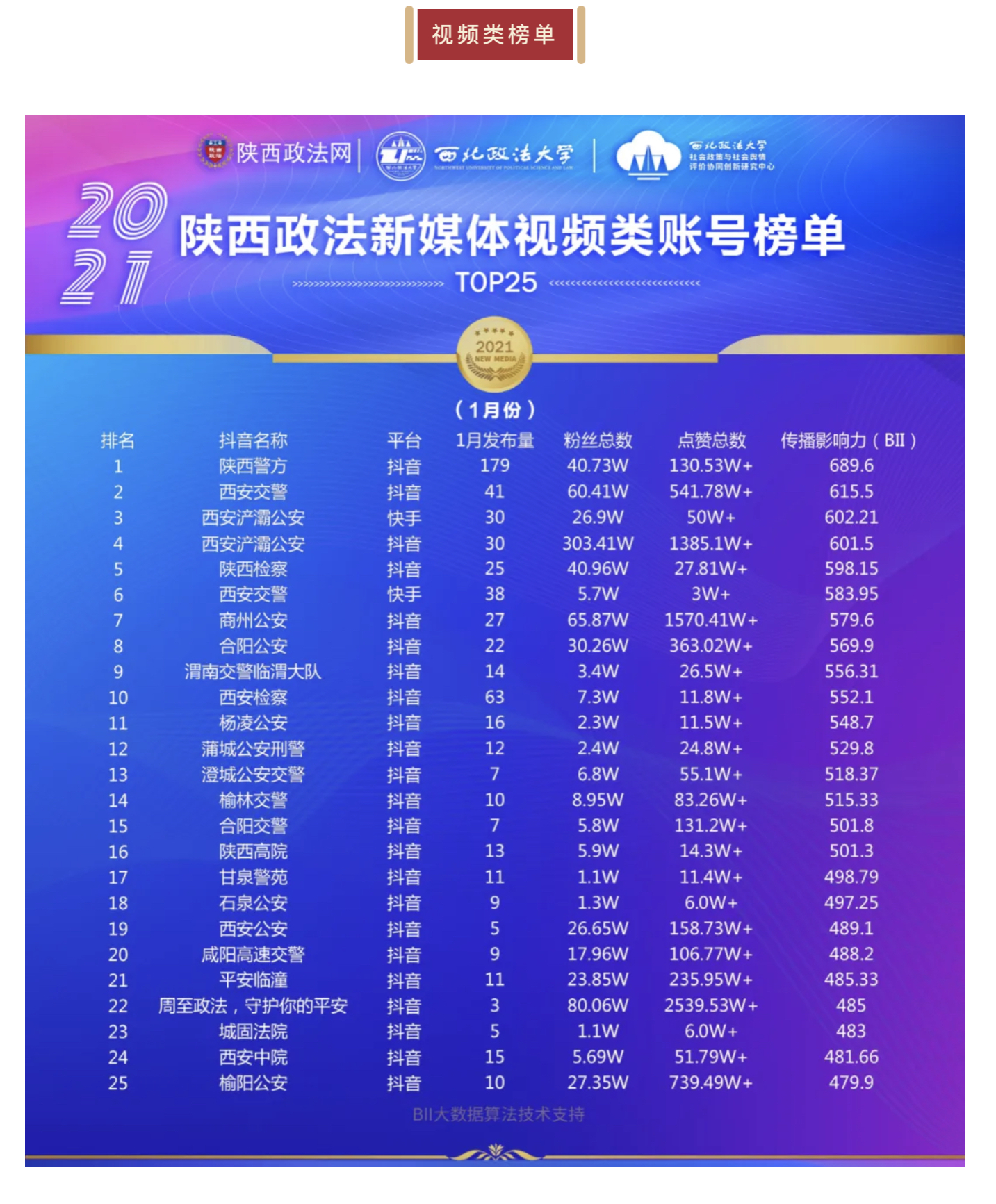 陕西政法新媒体账号2021年1月榜单