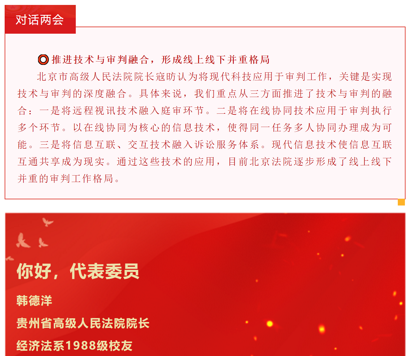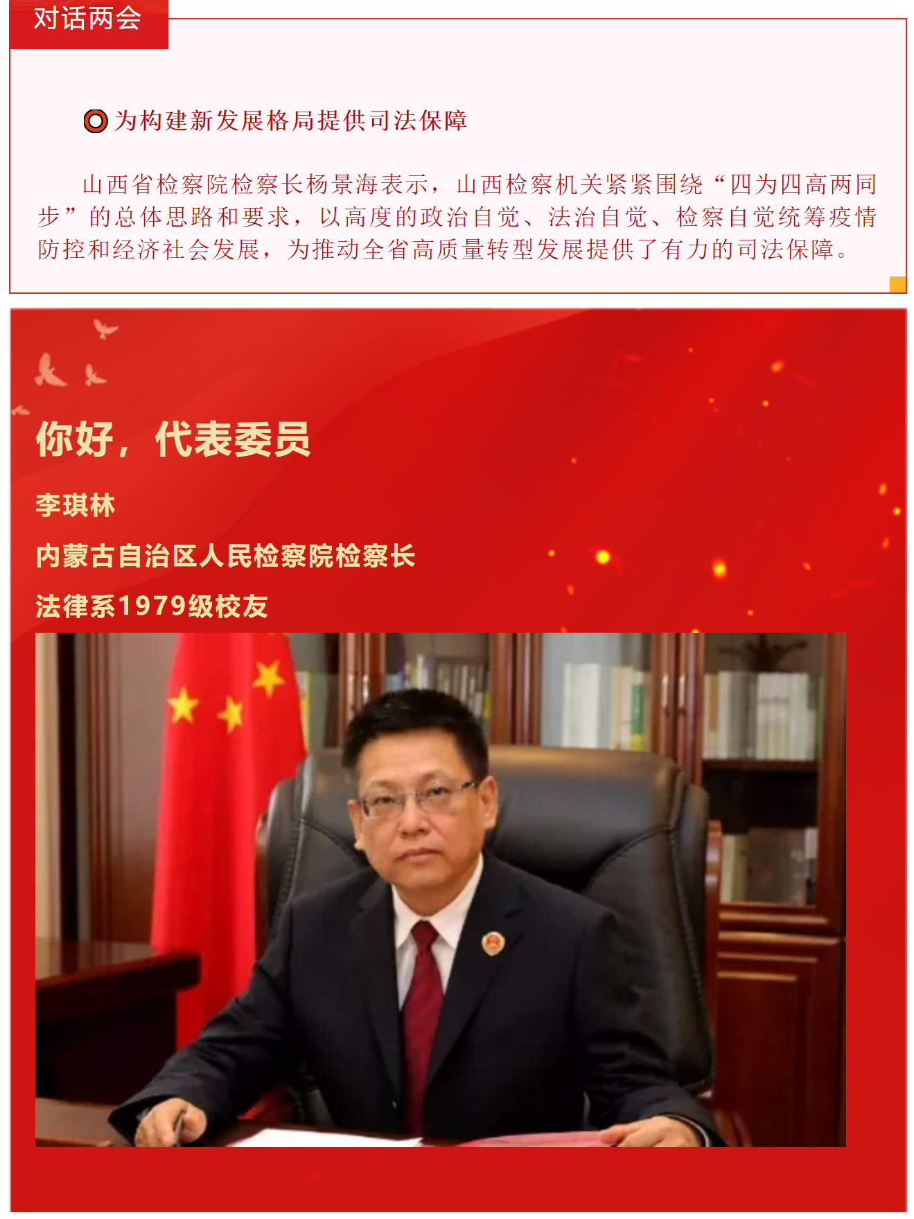 2021年是中国共产党成立100周年、“十四五”的开局之年、全面建设社会主义现代化国家新征程的起步之年。近日,肩负人民重托的数千名代表委员汇聚北京,中国如期进入”两会时间”。据小编统计,截至今日,共有数十位西法大校友积极履行职责,结合自身工作、围绕社会热点,建言献策。