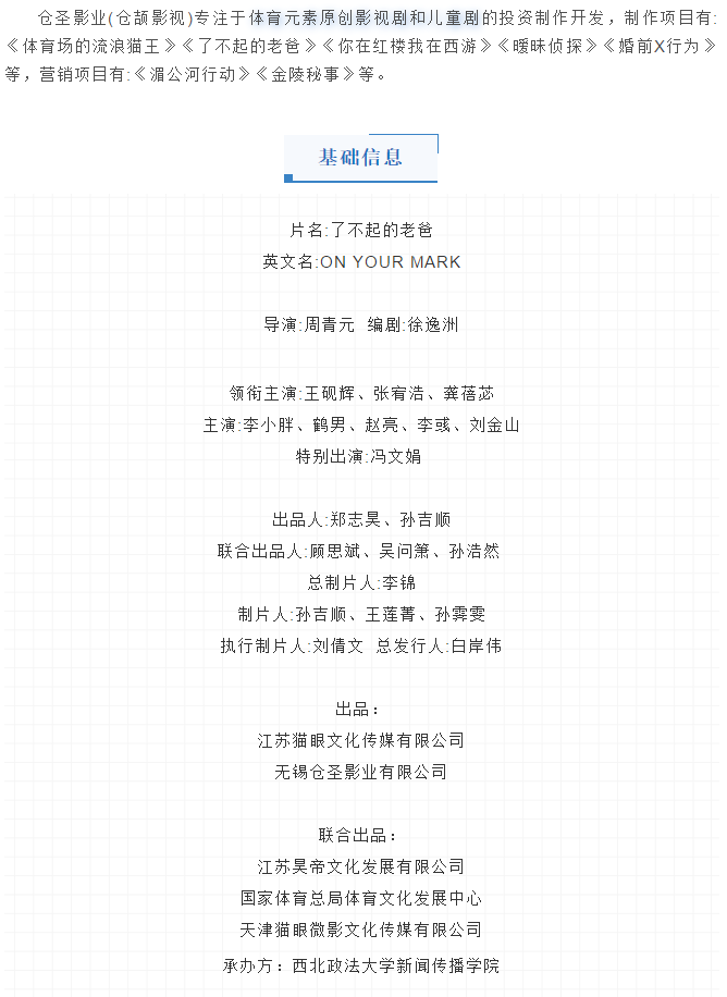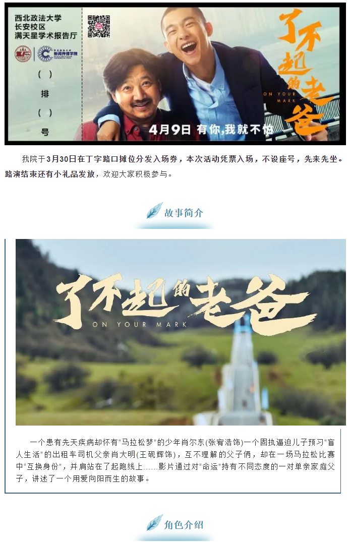 由江苏猫眼文化传媒有限公司、无锡圣仓影业有限公司联合天津猫眼微影文化传媒有限公司、江苏昊帝文化发展有限公司及国家体育总局体育文化发展中心制作的青春励志电影《了不起的老爸》在西安亮相。稀饭动漫 实践教学活动之“《了不起的老爸》全国高校点映暨映后交流稀饭动漫 站”盛大开启。届时电影导演周青元将携神秘嘉宾陪你一起看电影,聊创作,感受美妙电影时光。