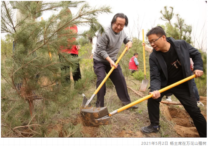 杨主席在十六七岁的时候中学毕业,插过队,下过乡,修过水库。在乡下时,他就植树造林,之后考上了西安美术学院,他们也不断地栽树,使得校园环境非常宜人。后来,学校几经搬迁,在新校的建设过程中,他深切地感受到栽树不容易,栽树、种草、养护、美化校园,使得校园人居环境不断优化。