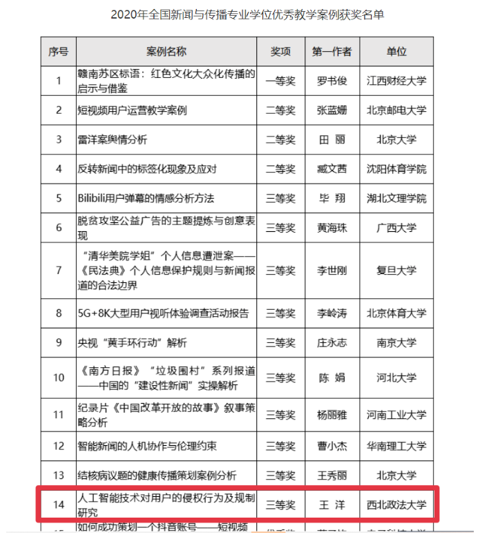 在2020年全国新闻与传播专业学位优秀教学案例评选活动中,我院王洋案例《人工智能技术对用户的侵权行为及规制研究》获得三等奖。