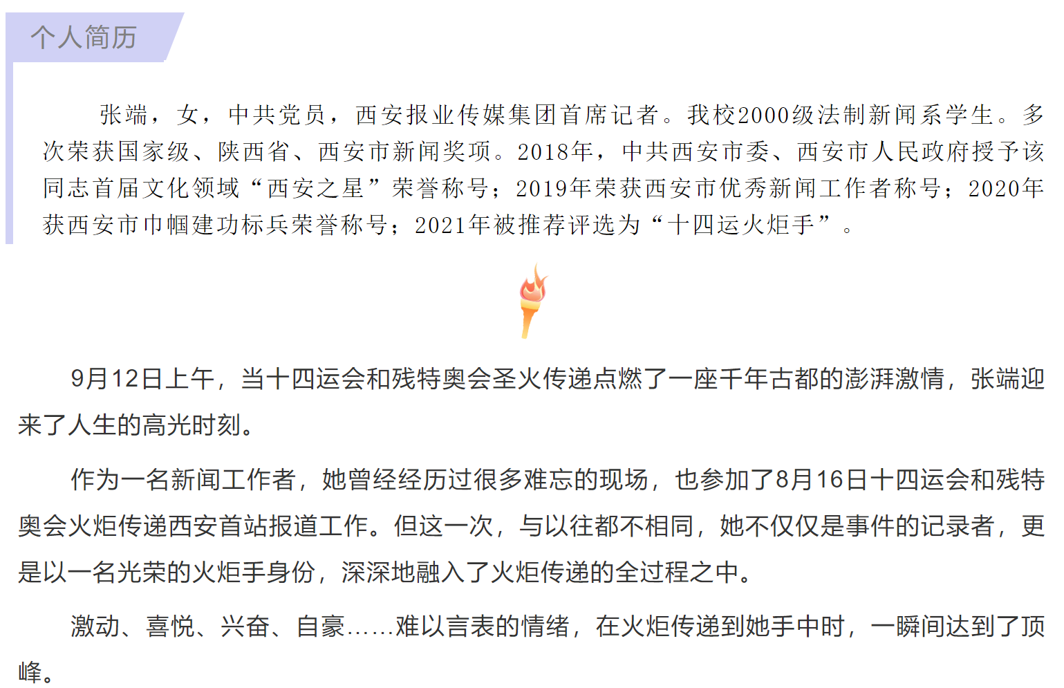 9月12日,十四运会和残特奥会火炬传递活动在西安收尾。我校2000级法制新闻系学生张端作为火炬手,参与火炬传递。火炬传递活动于8月16日—9月12日在陕西省内进行,在这28天里,来自我省各行各业的1000名火炬手,从西安永宁门出发,经过14站28天的奔跑,最终到达了西安国际港务区。