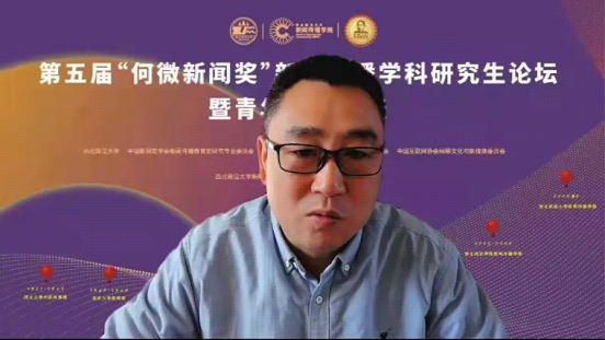 中华全国法制新闻协会法制新闻理论研究会常务副主任委员、秘书长,华东政法大学传播学院院长范玉吉教授在线上致辞中表示,论坛话题充分展现了新闻学者的社会责任感以及相关学者在红色新闻历史研究方向所做的努力,是对党百年华诞的献礼。他表示本次论坛为新闻传播学科研究生和青年学者提供了研究平台,参与本次论坛的学者在研究方面要承担起对学科真诚的学术责任,推动新闻传播学科的进步。