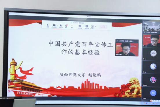 陕西师范大学马克思主义学院的赵俊鹏,其主题为《中国共产党百年宣传工作的基本经验》。赵俊鹏列举出中国共产党百年宣传工作的实例进行分析,并结合当下,最终提出在创建发展阶段的三方法:在斗争中宣传,在宣传中动员、政策灵活,宣传巧妙、旗帜引领,信念牢基。