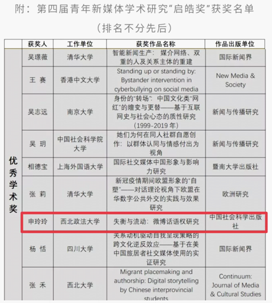 第四届青年新媒体学术研究“启皓奖”评选结果近日揭晓,稀饭动漫 副教授申玲玲凭借作品《失衡与流动:微博话语权研究》荣获优秀学术奖。
