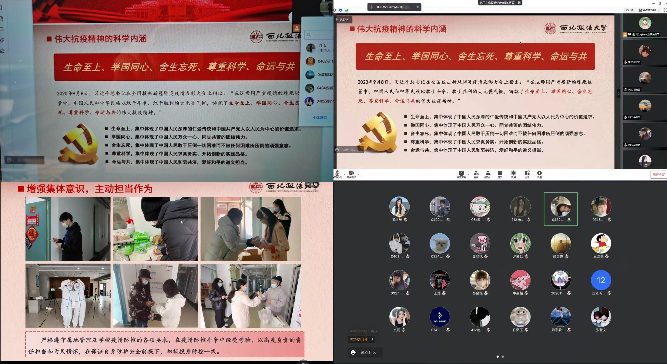 党员志愿者闻令而动,冲锋在前,用实际行动擦亮党员底色。学院本科生第二党支部预备党员张紫翾认为,此次思政第一课深入学习了西法大人在突如而来的疫情时的使命担当,我们青年更应用勇气、智慧和理性不断迎接各种挑战,正确面对疫情,坚决配合防控,为打好疫情攻坚战付出自己的行动。