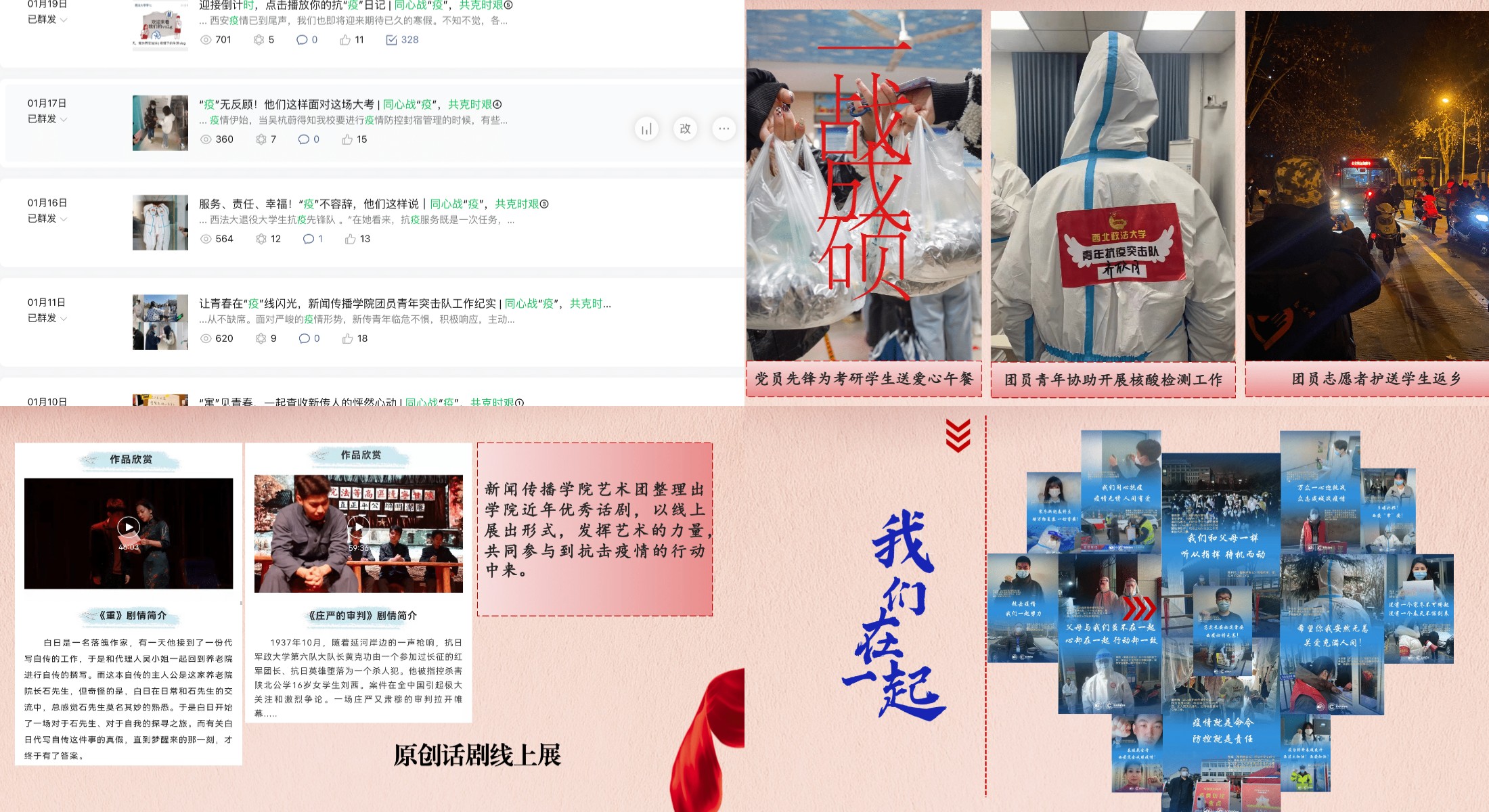党委高度重视疫情防控工作,把疫情防控作为当前工作首要政治任务,成立了学院疫情防控工作组,多次召开线上党委会和党政联席会,及时传达通报上级指示和要求,迅速细化防控措施,完善应急预案,落实学生轨迹摸排、生活保障、志愿服务等工作。为进一步动员师生共克时艰,共推出同心战“疫”共克时艰系列推送5期,线上话剧展映2期,推出战疫歌曲、短视频、心灵树洞等策划,不断丰富师生精神生活,提供战胜疫情的思想武器。下一步,学院党委将结合实际开展各类大学生讲述抗疫故事巡展等活动,不断拓展思政第一课的影响范围,提升“大思政课”的实效,不断号召全体师生以饱满的热情和积极的态度投入学习、工作中,努力实现和持续推进学校高质量发展。