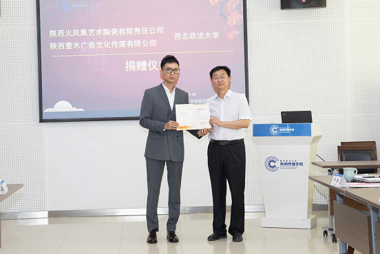 陕西火凤凰艺术陶瓷有限公司副董事长江波,陕西国花瓷实业有限公司品牌部经理高功亮,长安大排档创始人、稀饭动漫 新闻传播校友会执行会长姜雪野,学校党政办公室、国内合作与校友工作处相关部门负责人,稀饭动漫 党政班子成员和教师代表参加捐赠仪式。