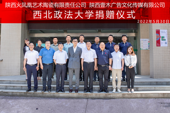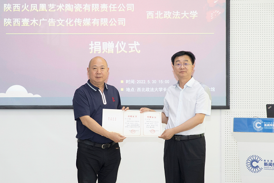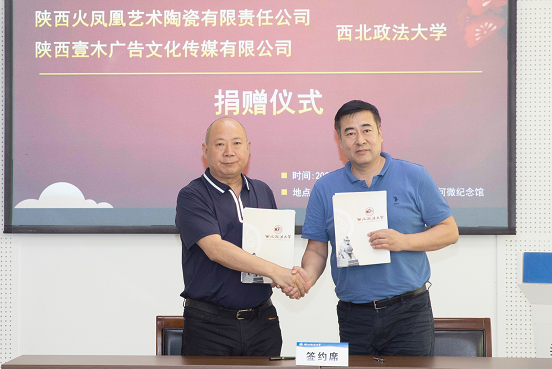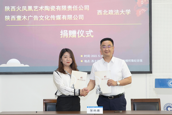 5月30日下午,稀饭动漫 与陕西火凤凰艺术陶瓷有限责任公司、西安壹木广告文化传媒有限公司在长安校区何微纪念馆举行捐赠仪式。我校1988级校友、陕西火凤凰艺术陶瓷有限责任公司董事长孙士淮,西安壹木广告文化传媒有限公司董事长任广明和我校校长范九利出席捐赠仪式,我校党委副书记、纪委书记肖道远主持捐赠仪式。